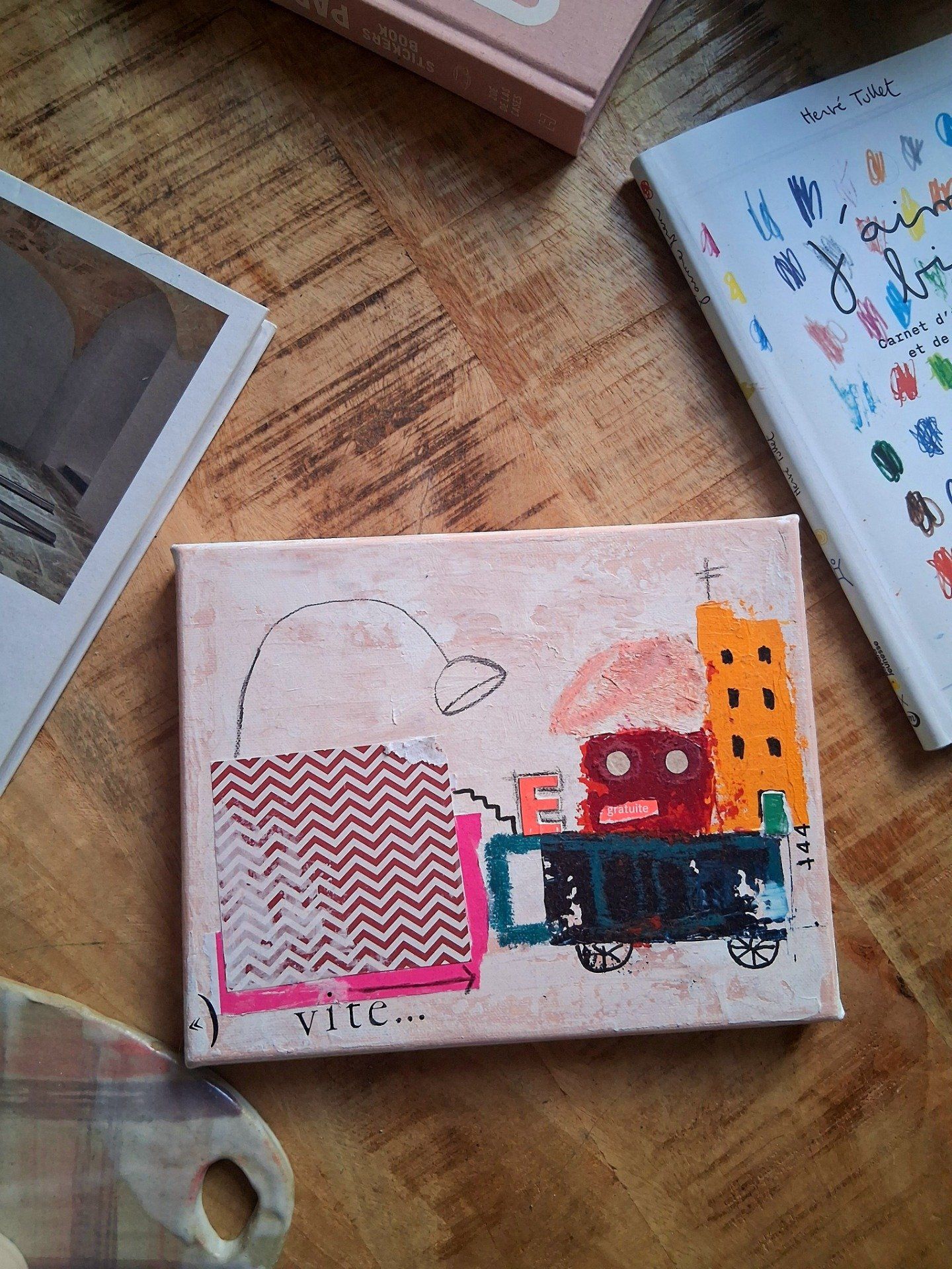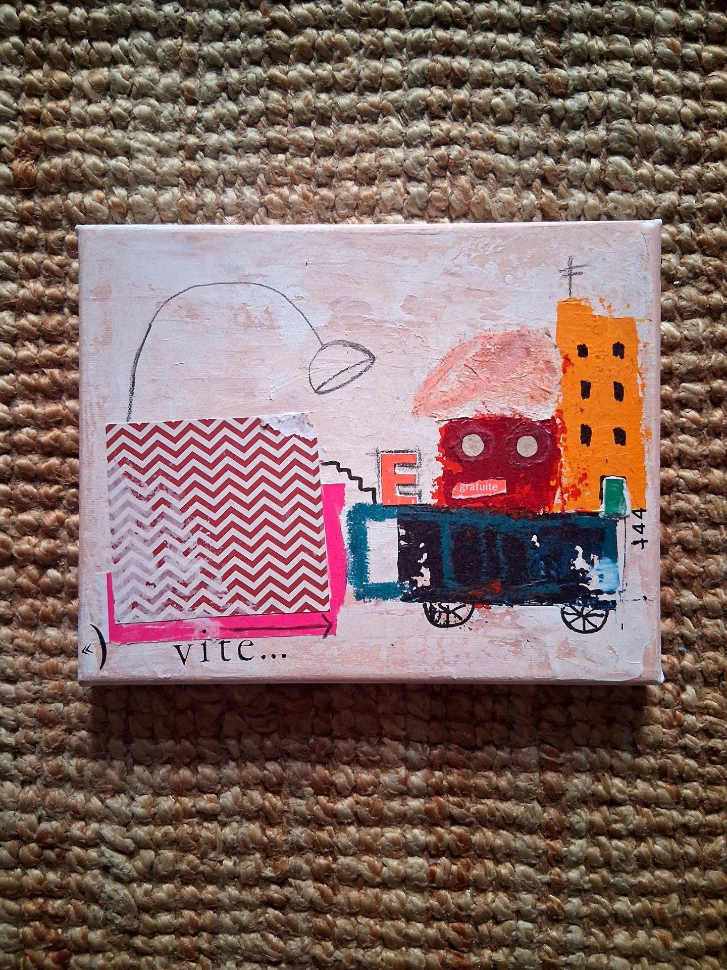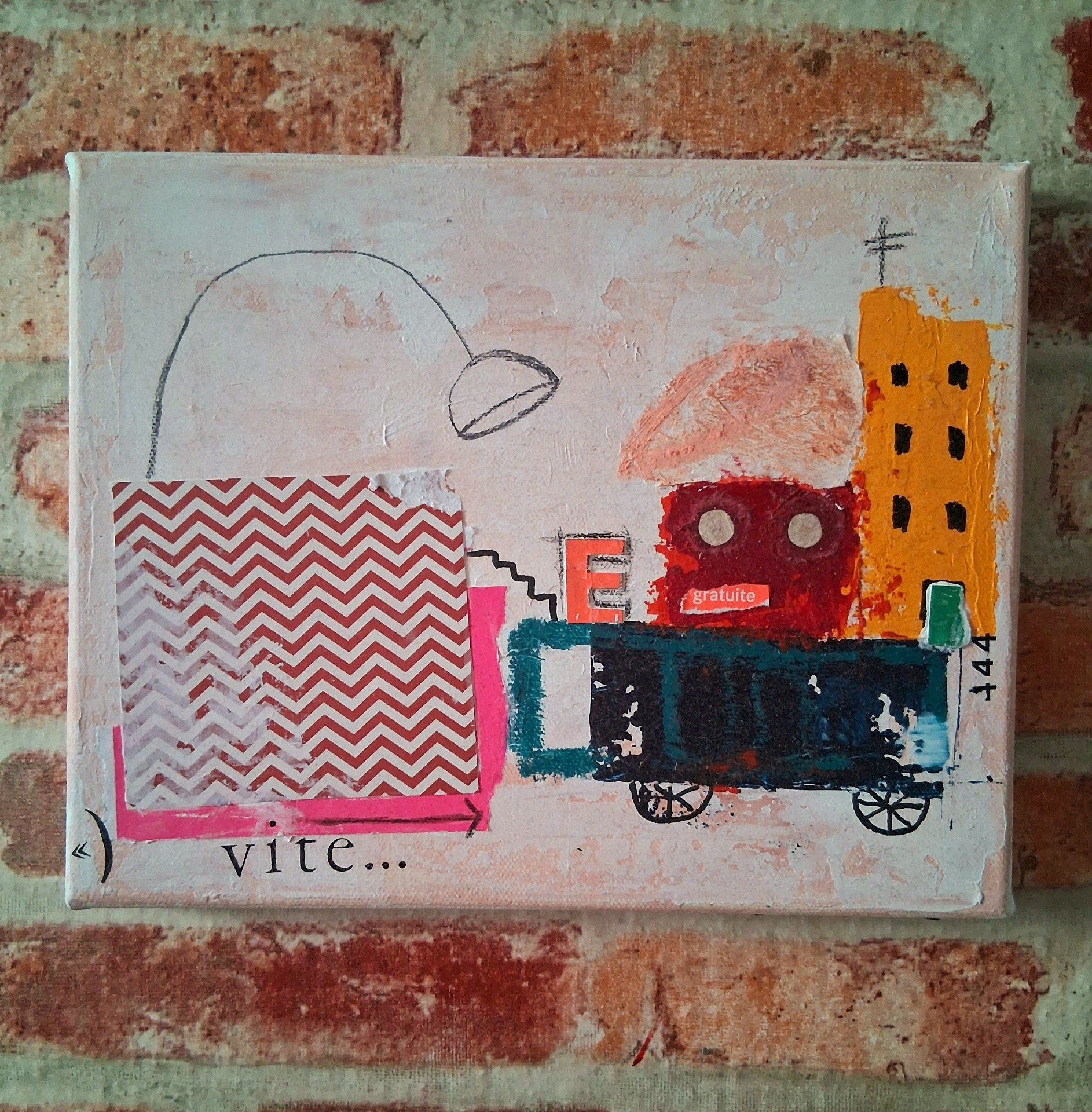 Tableau d'art abstrait mixed media 18 x 23 cm. Peinture acrylique, collage, papiers, pastels, Letraset, crayons sur châssis entoilé en coton.